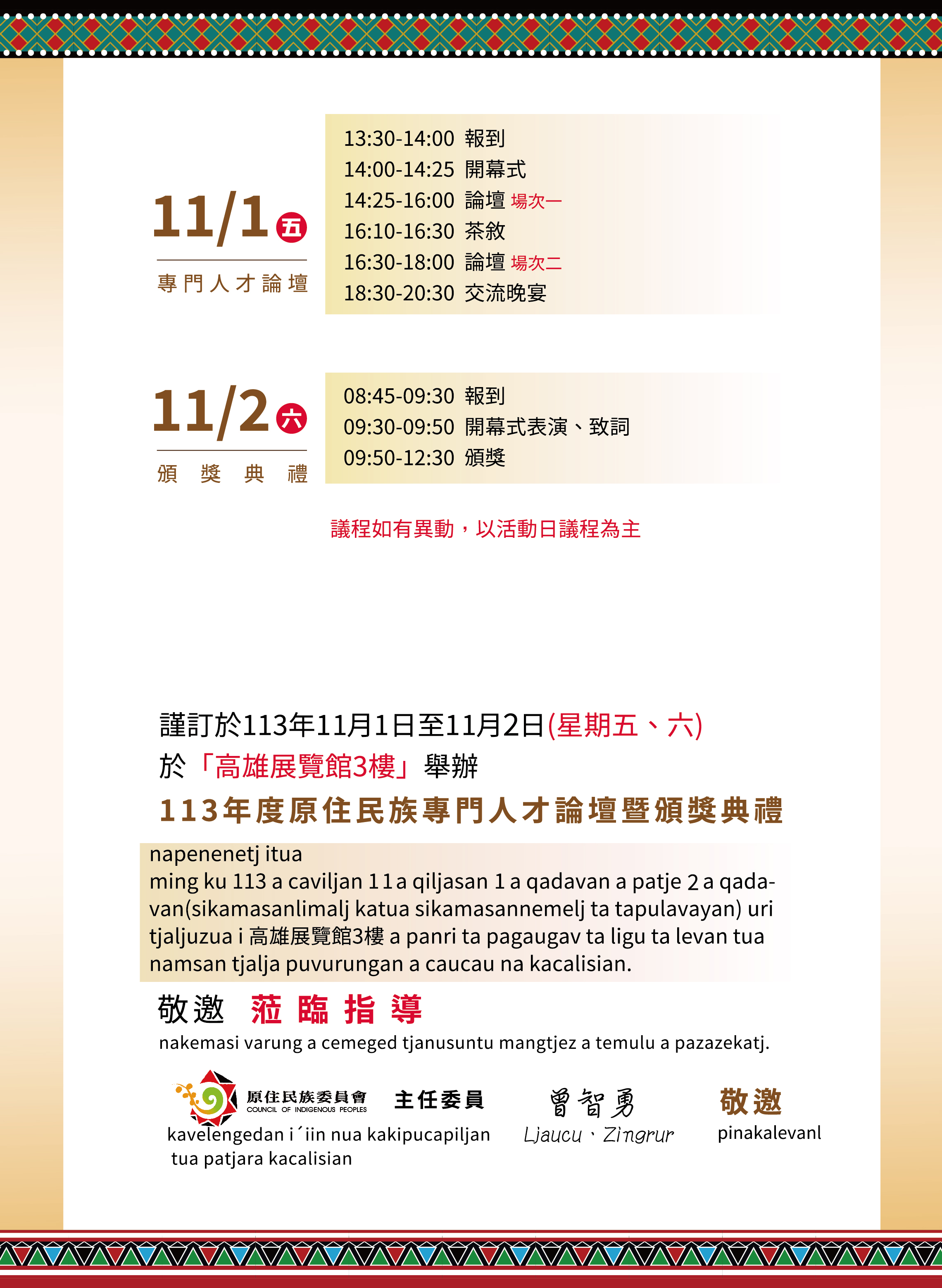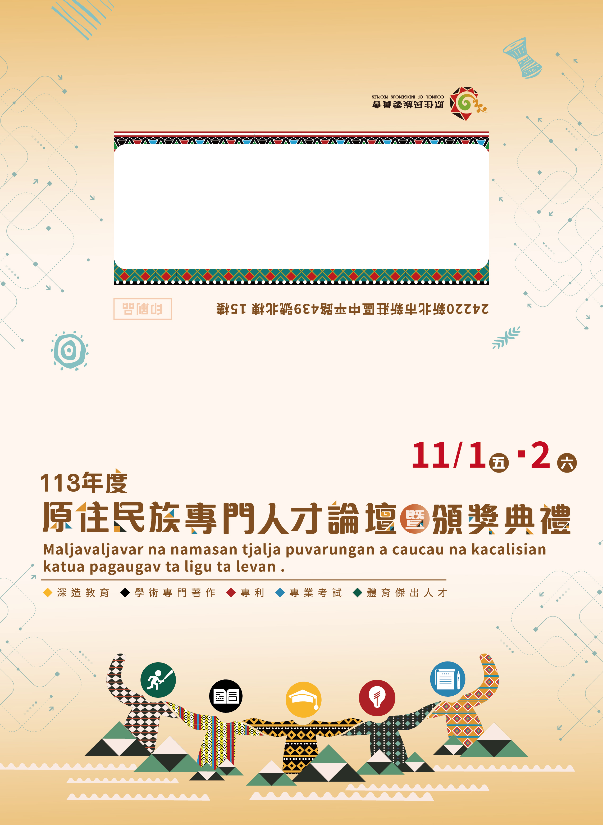 「113年度原住民族專門人才論壇暨頒獎典禮」延至113年11月1日、11月2日(星期五、六)舉辦
