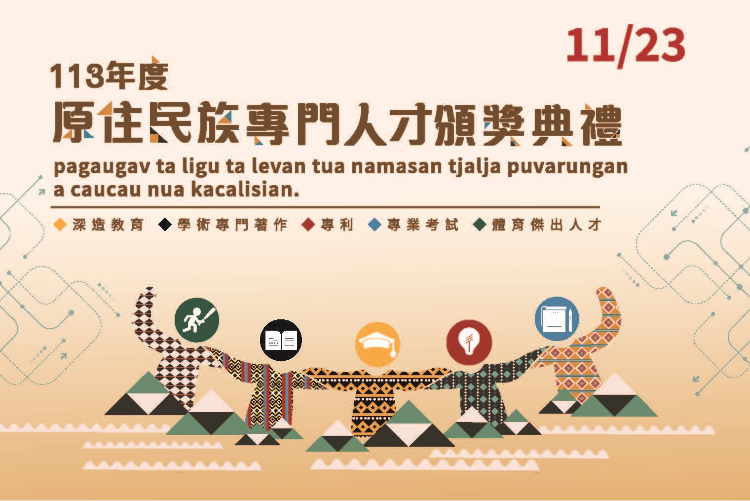 「113年度原住民族專門人才頒獎典禮」延至113年11月23日(星期六)舉辦